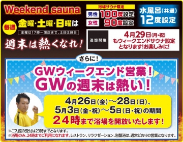 ゴールデンウイーク期間は、毎日終日ウィークエンドサウナ!