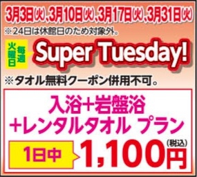 【イベント】Super Tuesday(3月の平日毎週火曜日は、岩盤浴がオトク!)