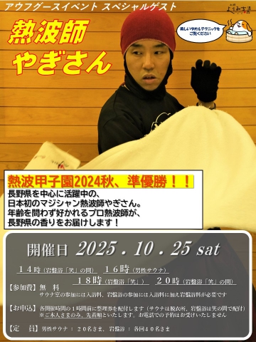 10月25日(土)は、やぎさん さんが、よりみち温泉に初登場します!男性サウナと、岩盤浴でアウフグースを開催します。長野県を中心に活躍中の日本初のマジシャン熱波師やぎさん。年齢を問わずに好かれるプロの熱波師が、土岐よりみち温泉で、長野県の香りをお届けします!お申込みは当日、先着順です!