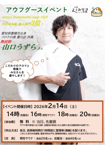 2月14日(土)は、愛知県豊橋市出身!「コロナの湯 豊川店」所属のアウフギーサー山口うずら さんが登場!男性サウナと、岩盤浴でアウフグースを開催します!長身を活かしたダイナミックなスイングによる熱風と、音楽に合わせたリズミカルなタオルテクニックで心身ともに温まるアウフグースをお届けします。サウナ室で羽ばたく、山口うずらをぜひご覧くださいお申込みは当日、先着順です!