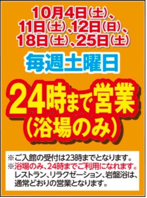 (※)浴場のみ24時までご利用になれます。レストラン、リラクゼーション、岩盤浴は通常どおりの営業時間となります。