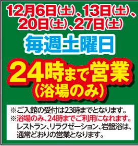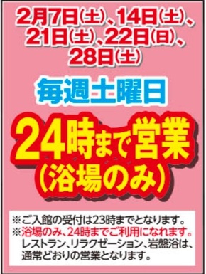 (※)浴場のみ24時までご利用になれます。レストラン、リラクゼーション、岩盤浴は通常どおりの営業時間となります。