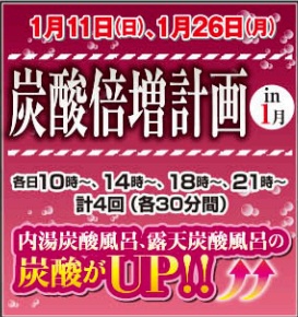 1月も炭酸倍増day開催!炭酸風呂の炭酸がUPします!!毎月11日・26日開催時間:10時~、14時~、18時~、21時~(各回30分)超炭酸泉の倍増された炭酸で、さらに美肌!健康に!