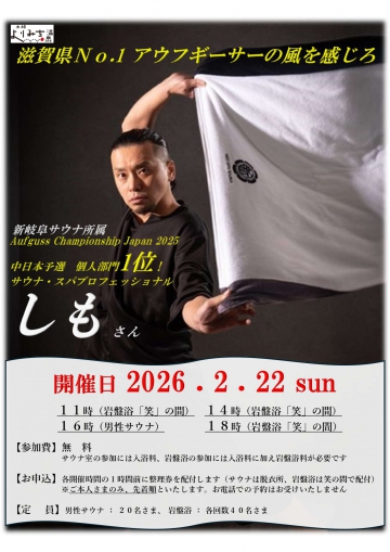 2月22日(日)は、「新岐阜サウナ」所属、滋賀県No.1アウフギーサーしも さんが、よりみち温泉に来店します!男性サウナと、岩盤浴でアウフグースを開催します滋賀県No.1のアウフギーサーの風を感じるチャンス!心も体も整ってください!お申込みは当日、先着順です!