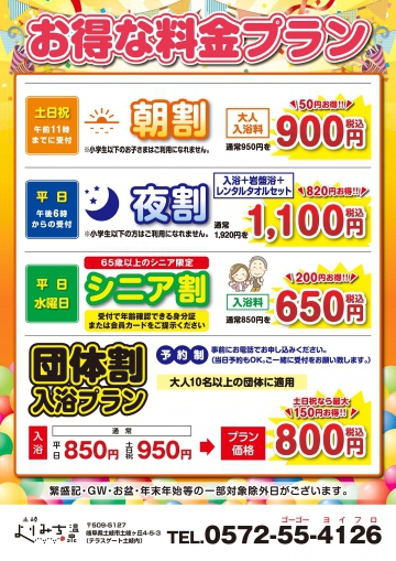 65歳以上のお客様は、入浴料850円⇒650円♪