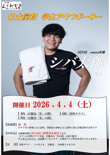 4月4日(土)は、現役学生アウフギーサーシバ太郎 さんが、よりみち温泉に来店します!男性サウナと、岩盤浴でアウフグースを開催しますお申込みは当日、先着順です!