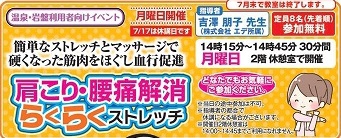 よりみち温泉内で、肩こり・腰痛解消らくらくストレッチ教室を行います。