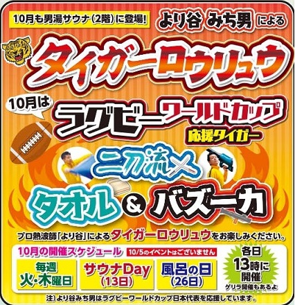 【2023年10月火曜・木曜・13日・26日の13時限定】プロ熱波師「より谷みち男」によるタイガーロウリュウ!