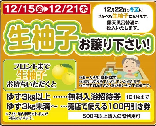 【終了しました】生ゆずをゆずってくださいイベント(ゆず3㎏以上お持ちで入浴招待券プレゼント)