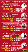 [温泉] 9:00~23:00(土~24:00) [岩盤浴] 9:00~22:30 [リラクゼーション] 10:00~22:00 [レストラン] 平日11:00~22:00(土日祝9:00~) ※最終入館受付 22:00、ラストオーダー 月~木21:00 金~日21:30 |