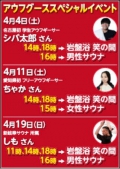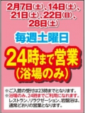 [温泉] 9:00~23:00(土~24:00) [岩盤浴] 9:00~22:30 [リラクゼーション] 10:00~22:00 [レストラン] 平日11:00~22:00(土日祝9:00~) ※最終入館受付 22:00、ラストオーダー 月~木21:00 金~日21:30 |